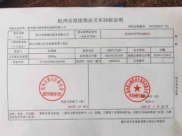 杭州市報(bào)廢柴油叉車(chē)回收證明