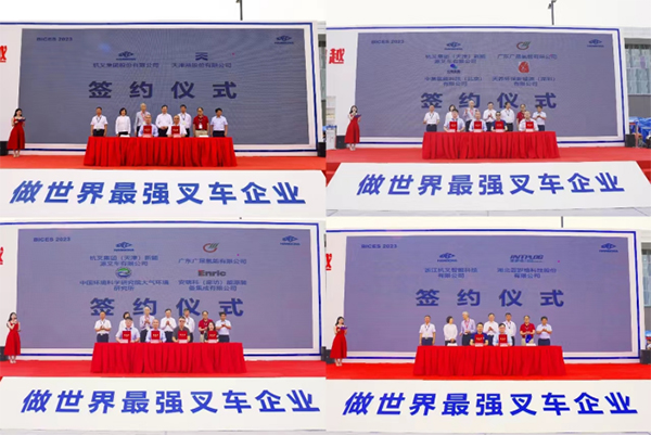 高端的產(chǎn)品、卓越的品質(zhì)、強(qiáng)大的性能獲得了廣大客戶的認(rèn)可,各方合作伙伴積極于杭叉集團(tuán)進(jìn)行戰(zhàn)略合作簽約,成就價(jià)值,共贏未來。杭叉集團(tuán)和天津港股份有限公司簽訂港口用滾裝電動叉車設(shè)計(jì)開發(fā)及應(yīng)用技術(shù)研究項(xiàng)目開發(fā)協(xié)議,致力于推動港口滾裝船設(shè)備作業(yè)環(huán)境的應(yīng)用與推廣。杭叉集團(tuán)和廣東廣晟氫能有限公司、中集氫能科技(北京)有限公司、天養(yǎng)環(huán)保新能源(深圳)有限公司簽訂氫燃料電池正面吊銷售協(xié)議及氫燃料電池工業(yè)車輛戰(zhàn)略合作協(xié)議,積極推動氫燃料電池工業(yè)車輛的推廣,促進(jìn)我國“綠色港口”的建設(shè),積極開展氫燃料電池工業(yè)車輛和氫氣供應(yīng)設(shè)備的研發(fā)和迭代更新工作,聯(lián)合制定符合氫燃料電池工業(yè)車輛市場化銷售和運(yùn)營的商業(yè)模式。杭叉全球首臺45噸燃料電池正面吊樣機(jī)現(xiàn)場就被預(yù)定,開展當(dāng)天實(shí)現(xiàn)簽單總額達(dá)上千萬元。杭叉集團(tuán)和中國環(huán)境科學(xué)研究院大氣環(huán)境研究所、安瑞科(廊坊)能源裝備集成有限公司、廣東廣晟氫能有限公司簽訂氫燃料電池工業(yè)車輛碳核算合作項(xiàng)目,將為進(jìn)一步完善我國碳排放交易機(jī)制提供有益探索,推動我國工業(yè)車輛向綠色、低碳、環(huán)保方向發(fā)展。杭叉智能科技和湖北普羅格科技簽訂智能物流解決方案戰(zhàn)略合作項(xiàng)目,雙方面向智慧園區(qū)、智慧倉儲、智慧工廠、智慧門店、智慧醫(yī)療等應(yīng)用場景,提供物流集成與總包、物流系統(tǒng)集成、倉儲物流自動化設(shè)備、精益生產(chǎn)物流及供應(yīng)鏈等企業(yè)數(shù)智化轉(zhuǎn)型一站式解決方案。