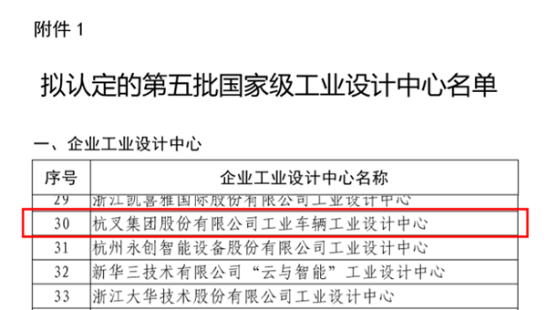 近日,工業和信息化部發文對擬認定的第五批國家級工業設計中心名單予以公示,杭叉集團股份有限公司(以下簡稱“杭叉集團”)工業車輛工業設計中心憑借在工業車輛領域領先的設計創新能力成功獲得認定,這是杭叉集團繼國家級企業技術中心、國家級博士后科研工作站等國家級榮譽后,再次獲批建設的國家級創新平臺。