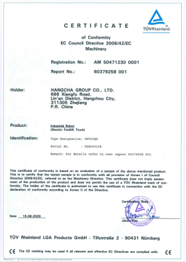 從技術層面看,工業叉車已從人工操控的機械產品向電子信息系統控制的智能產品轉變,對工業叉車的智能性和安全性提出了更高的要求。在認證機構萊茵的大力支持和指導下,杭叉集團協同三方技術力量,經過4個月密切配合,嚴格按照技術評審、關鍵零部件選型、樣機初檢、技術整改、現場試驗、資料整改要求,逐項攻克基礎性能、功能安全、電氣安全、風險評估中的技術難點,最終于2020年6月獲得了智能叉車領域無人駕駛工業車輛CE證書。