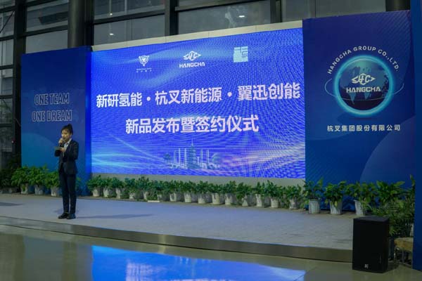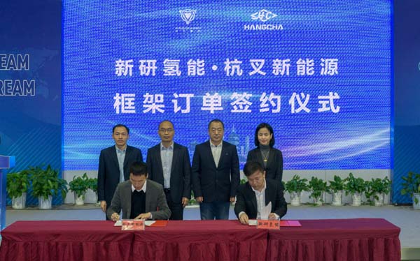 在新品發布后,杭叉新能源公司與新研氫能雙方簽訂了300臺燃料電池叉車框架采購協議,同時與新研氫能、翼迅創能三方共同簽訂了首批100臺燃料電池叉車采購訂單。