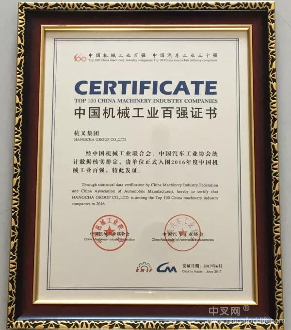杭叉集團榮獲2016年度中國機械工業百強企業的稱號