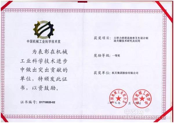 杭叉集團榮獲2017年中國機械工業科學技術獎一等獎